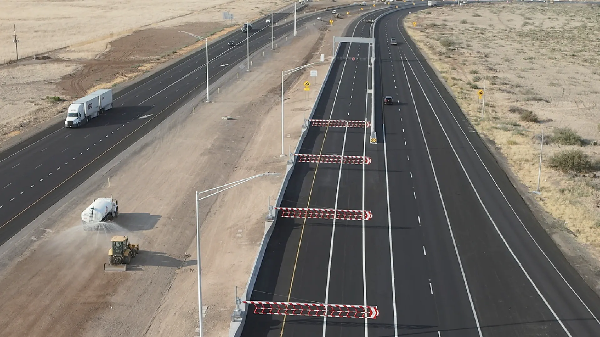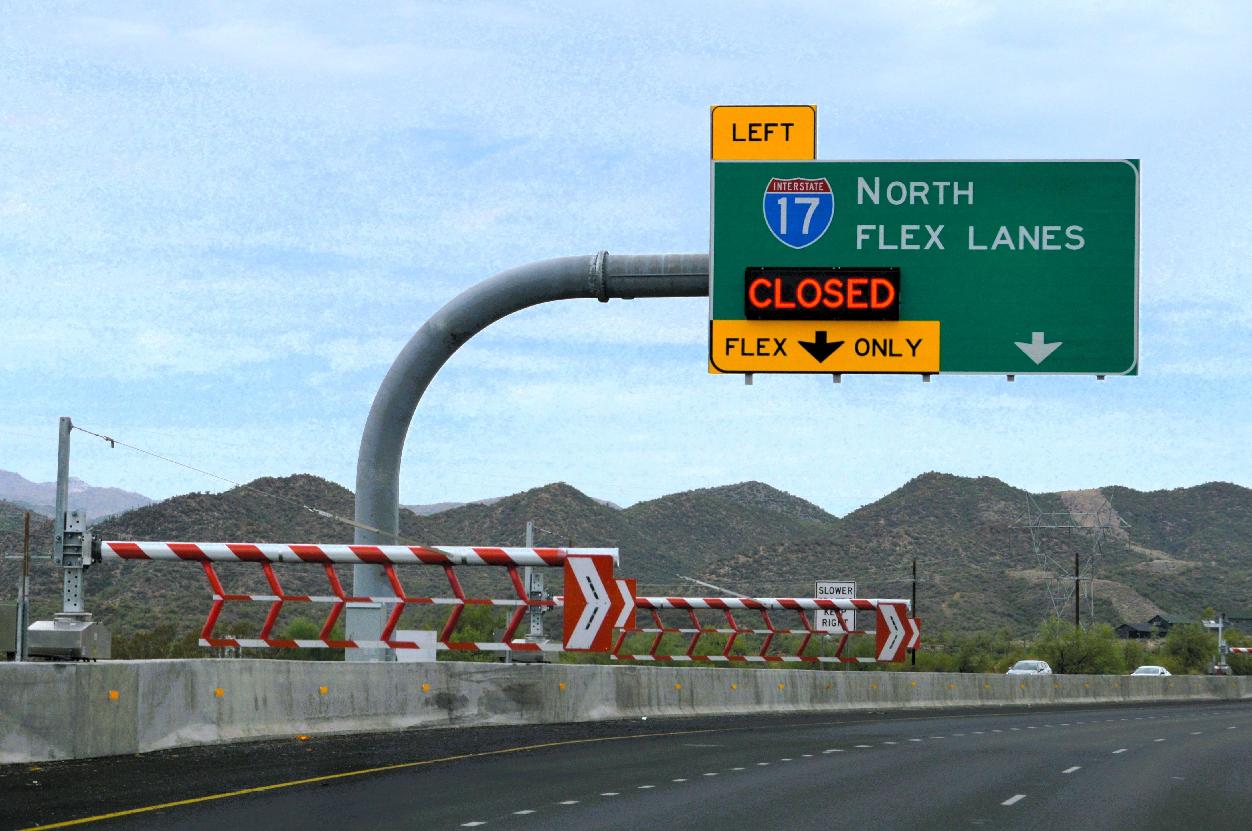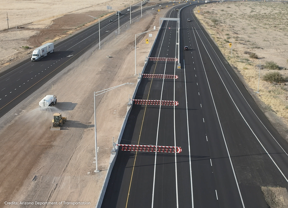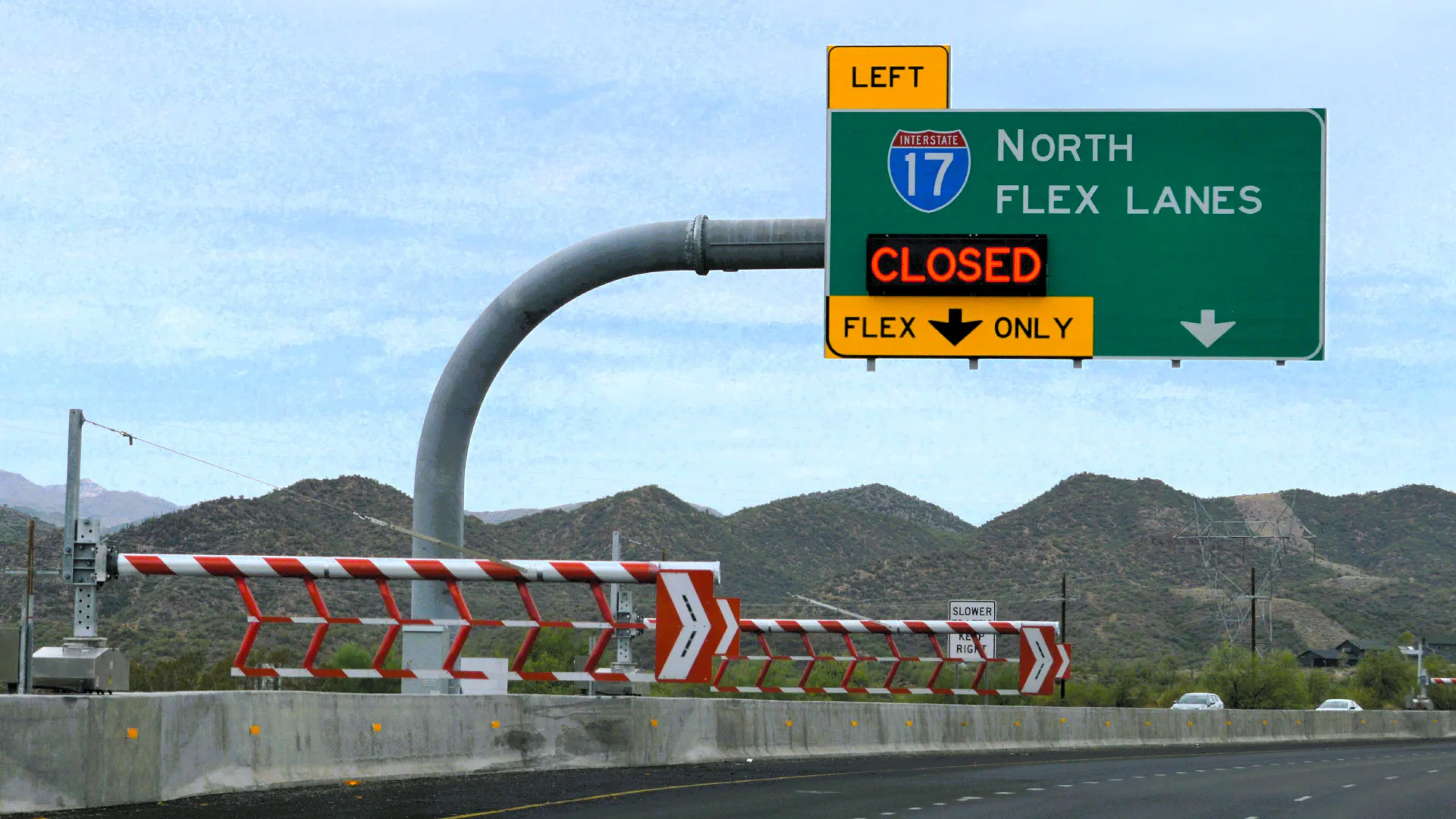 The I-17 flex lane system spans eight miles from Black Canyon City to Sunset Point, consisting of two reversible lanes constructed adjacent to existing southbound lanes. These lanes carry traffic in one direction at a time, alternating between northbound and southbound based on demand. A total of 58 automated swinging gates (Versilis SwiftGate HSG-40CW) are deployed to control the two slip ramps located at both ends of those flex lanes. The gates are deployed or retracted based on the traffic pattern. Vehicle Arresting Barriers (VAB) have also been implemented to stop an errant vehicle from entering the flex lanes in the wrong direction. At each approach, three dynamic Open Close message signs provided by Versilis inform drivers of lane availability in real-time. All I-17 flex lanes ITS components (Open Close Signs, Gates and VABs) are controlled and monitored from ADOT’s Traffic Operations Center (TOC) through a number of Versilis Commanders, acting as sequencers and offering all the necessary logic and checkpoints for a safe and reliable operation.The flex lanes operate seven days a week, typically serving northbound traffic Monday through Saturday and southbound traffic on Sundays, with flexibility to adjust based on actual traffic conditions or emergencies. The I-17 flex lane facility is notable as one of the few reversible lane systems with slip ramps using two lanes rather than one. The facility is also equiped with cameras, providing TOC operators full camera coverage of the segment, especially useful during reversals.
